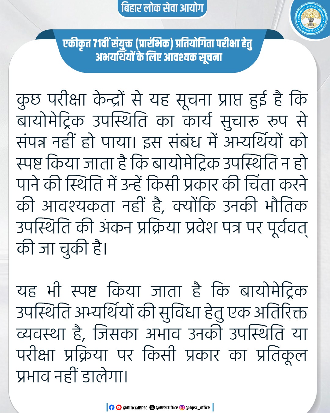 - Important Notice: Date of Commencement of Written Examinations for the posts of Laboratory Assistant, Law Officer, Assistant Environmental Engineer, Public Relation Officer & System Analyst in Bihar State Pollution Control Board under Environment, Forest and Climate Change Department, Govt. of Bihar. (Advt. No. 32/2025, 33/2025, 34/2025, 35/2025 & 39/2025).